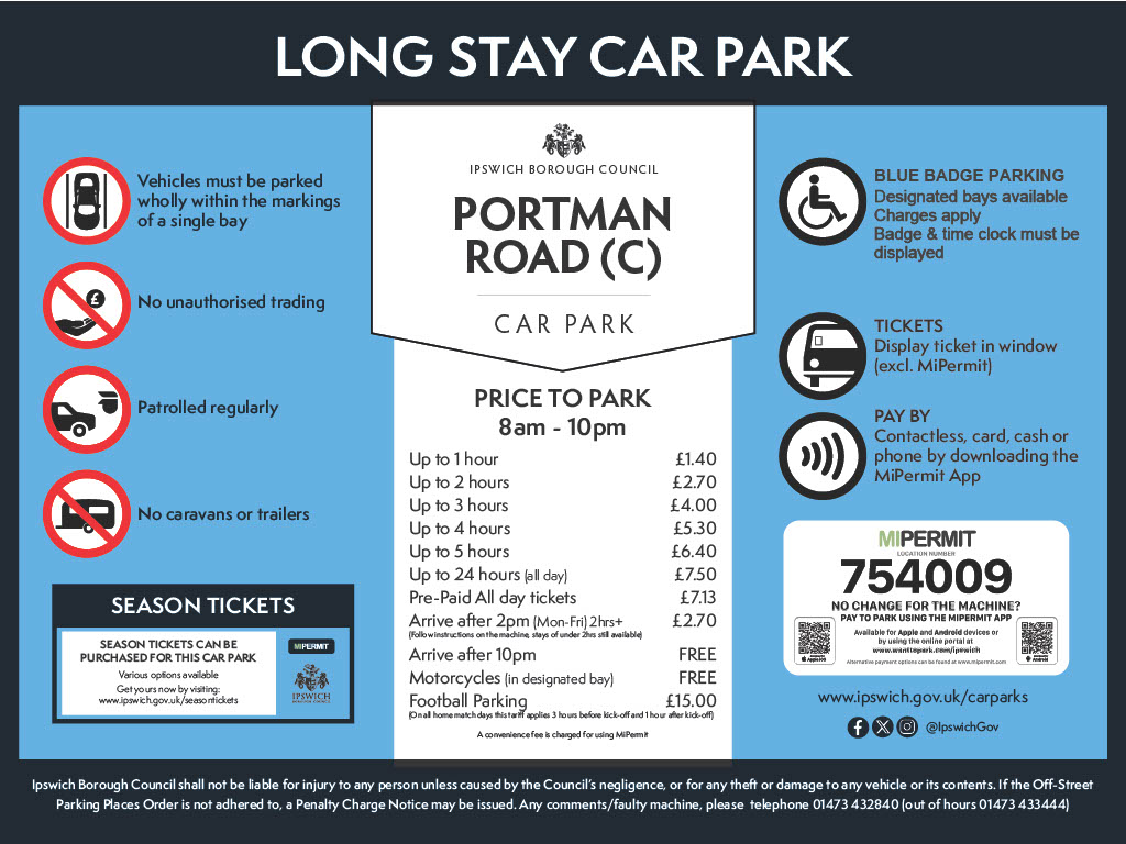 - Parking on Ipswich Town FC home match days a £15.00 Per Vehicle Fee applies from 3 hours before kick-off until 1 hour after kick-off, effective from Tuesday 3 December 2024.