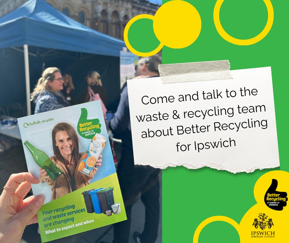 We’re holding some drop-in events over this Spring and Summer*, so you can meet the team, learn about the new government legislation on recycling, and find out more about changes to recycling and waste services starting in Ipswich on 1 June.